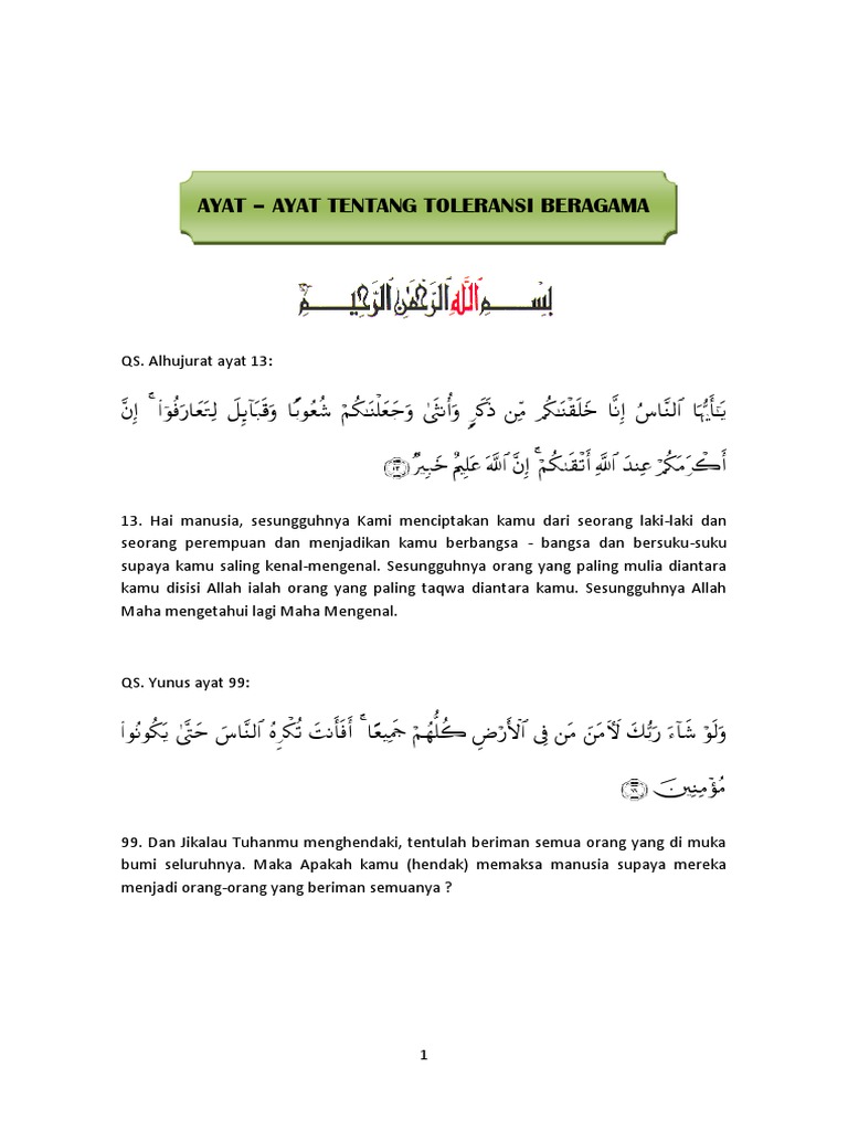 Dalam Ayat Al Quran nilai-nilai toleransi dibagi dua. Islam adalah rahmatan lil alamin saling mengasihi terhadap seluruh isi alam. Surah Al-Baqarah Ayat 256.